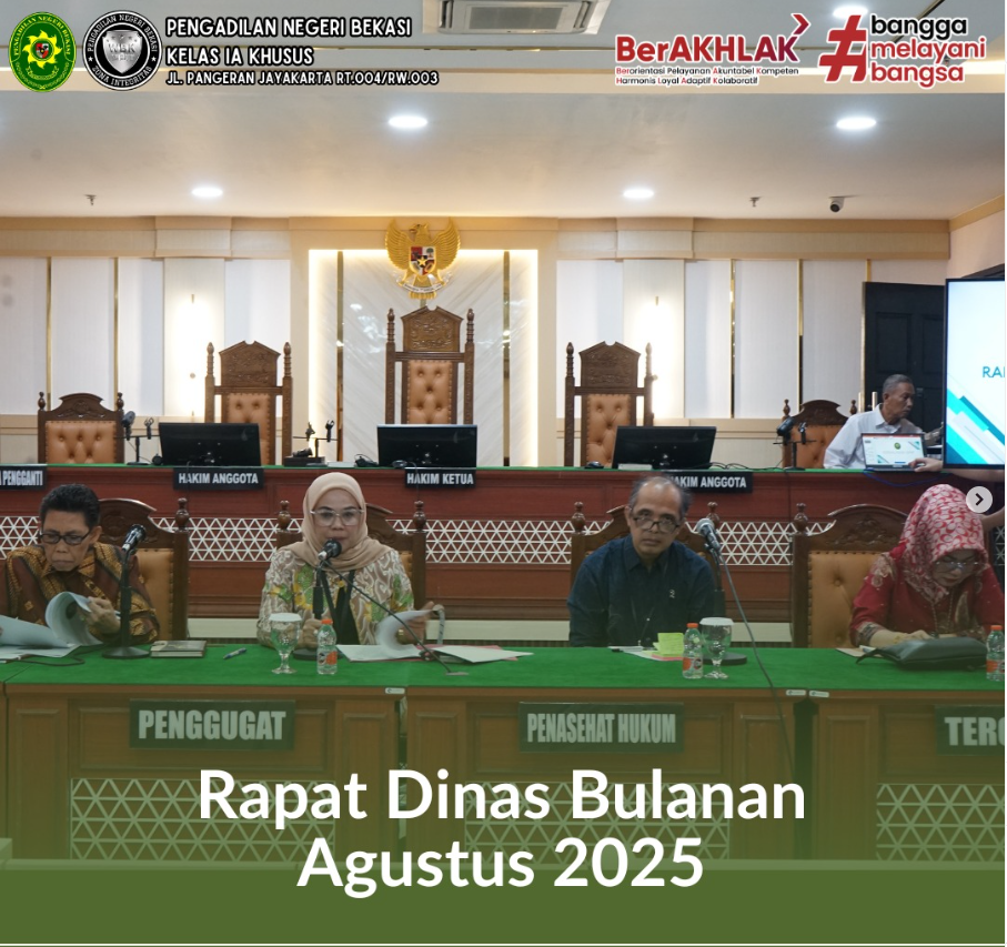 Pada bulan Agustus 2025, Pengadilan Negeri Bekasi kembali menggelar Rapat Dinas Bulanan dengan semangat tinggi! Rapat kali ini dipimpin langsung oleh Ketua Pengadilan Negeri Bekasi, yang memberikan arahan strategis untuk memajukan kinerja dan pelayanan di lingkungan pengadilan.