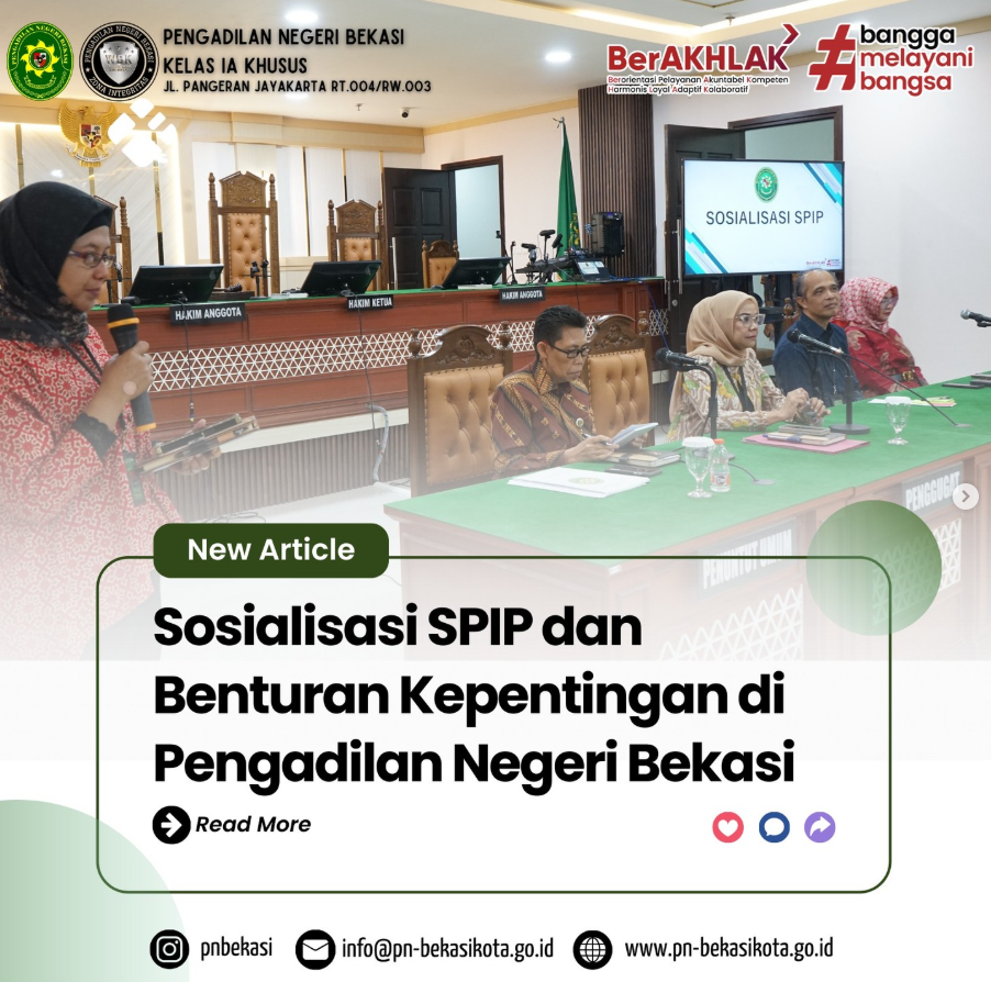 Pengadilan Negeri Bekasi menggelar acara sosialisasi Sistem Pengendalian Intern Pemerintah (SPIP) sebagai upaya untuk meningkatkan transparansi dan akuntabilitas di lingkungan pengadilan. Sosialisasi ini dihadiri oleh seluruh aparat penegak hukum dan pihak terkait.